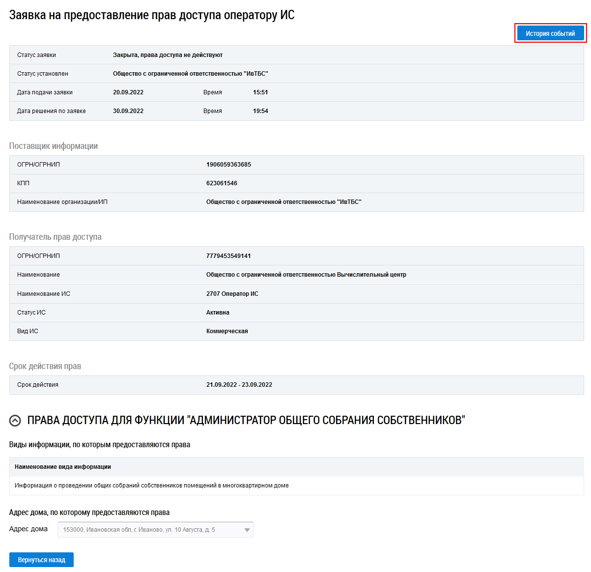 Для просмотра истории событий нажмите на кнопку История событий в верхней части страницы.