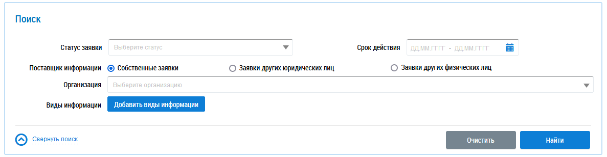При выборе варианта Собственные заявки или Заявки других юридических лиц