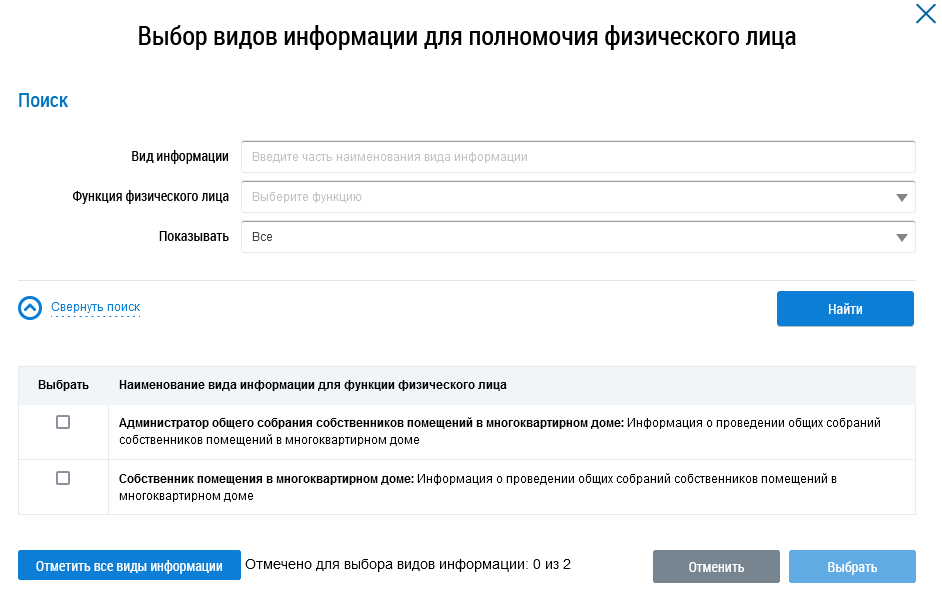 Установите флажок в поле необходимого вида информации и нажмите на кнопку Выбрать. При необходимости выбора всех видов информации нажмите на кнопку Отметить все виды информации.