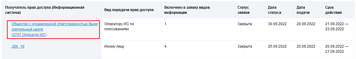 Для просмотра заявок на передачу прав доступа нажмите на гиперссылку с наименованием организации/ИП/физического лица на странице Переданные заявки на передачу прав доступа.