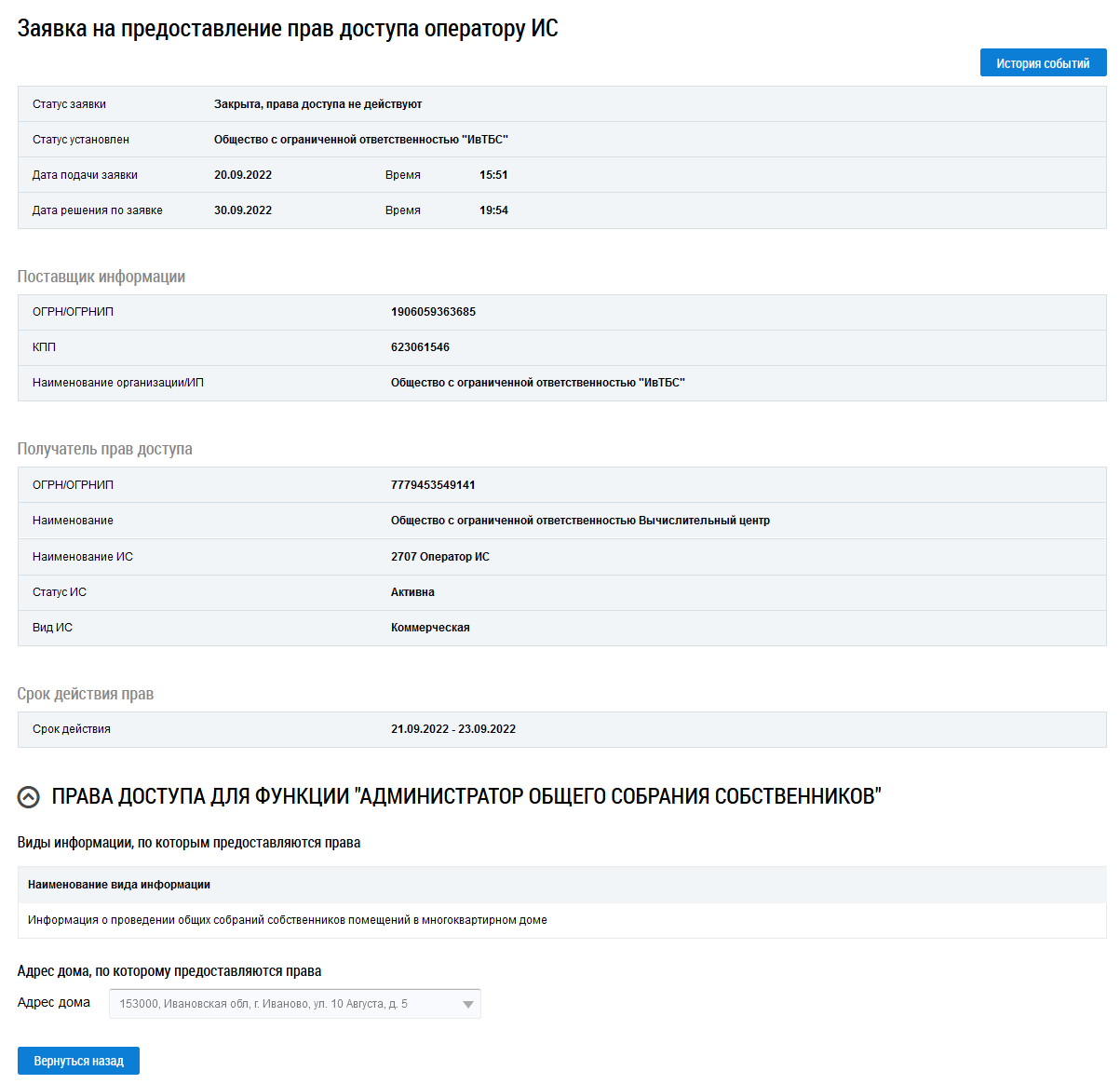 Отображается страница просмотра заявки на предоставление прав доступа.