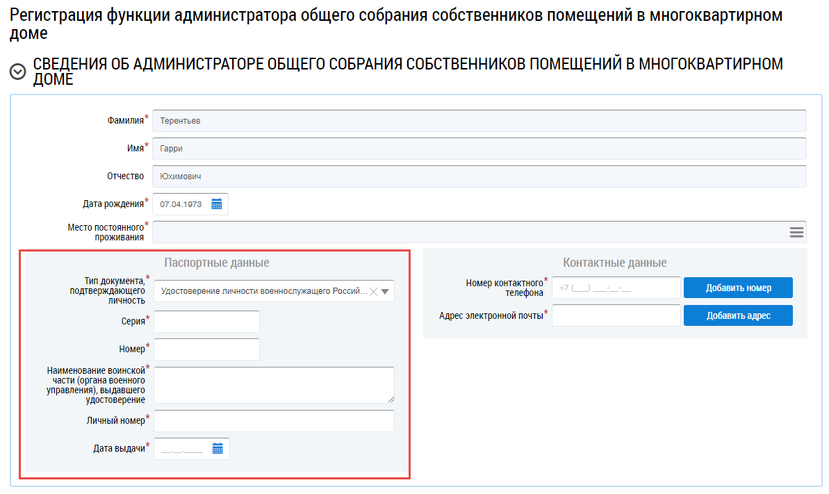 Заполните обязательные поля формы. Некоторые данные в подблоке Паспортные данные могут быть предзаполнены автоматически, если они были указаны в ЕСИА.