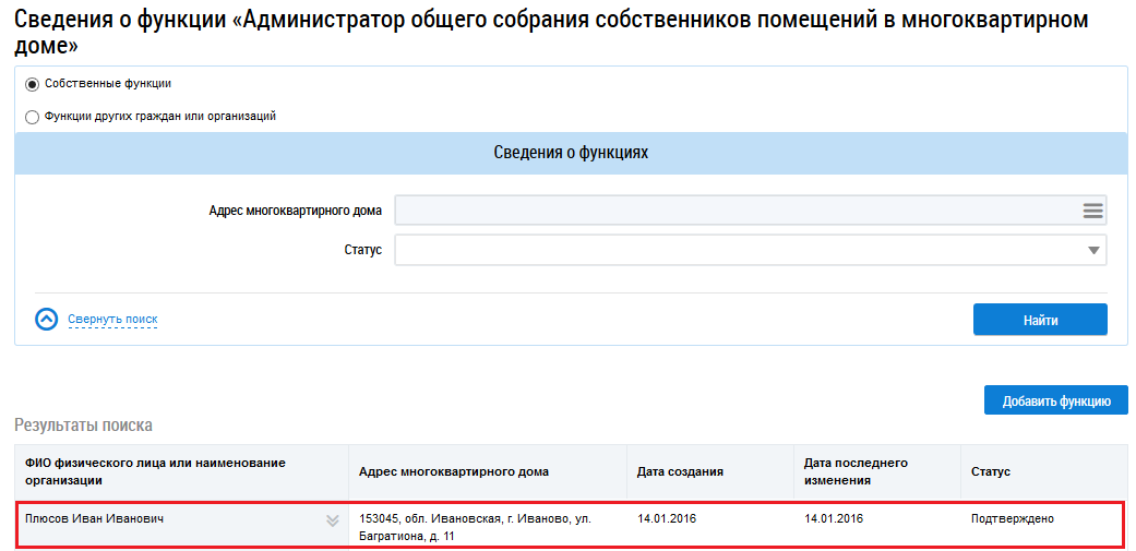 После подтверждения заявленной функции Органом государственного жилищного надзора субъекта РФ в ЛК гражданина на странице Сведения о функциях отображается функция со статусом Подтверждено.