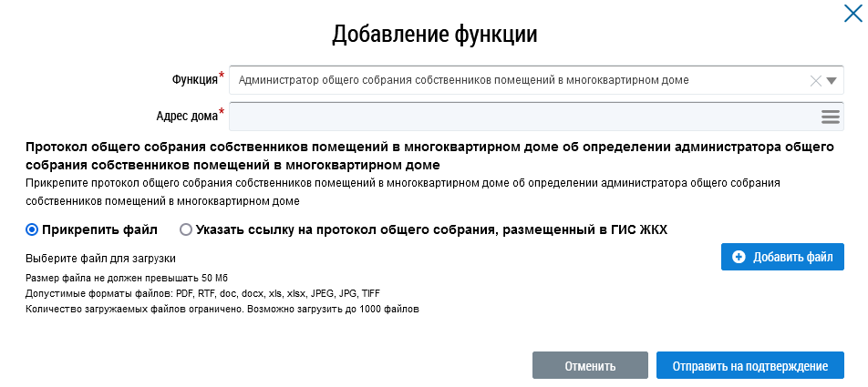 Укажите адрес дома. Прикрепите файл протокола общего собрания собственников помещений в многоквартирном доме об определении администратора общего собрания или укажите ссылку на него.