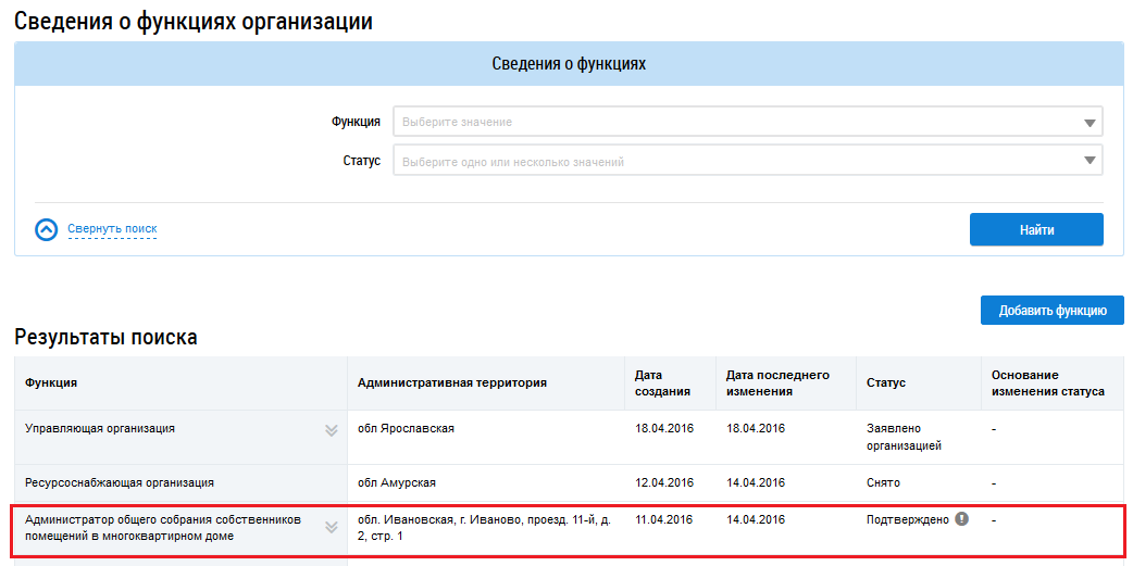 После подтверждения функции Органом государственного жилищного надзора в личном кабинете администратора организации на странице Сведения о функциях отобразится функция со статусом Подтверждено.