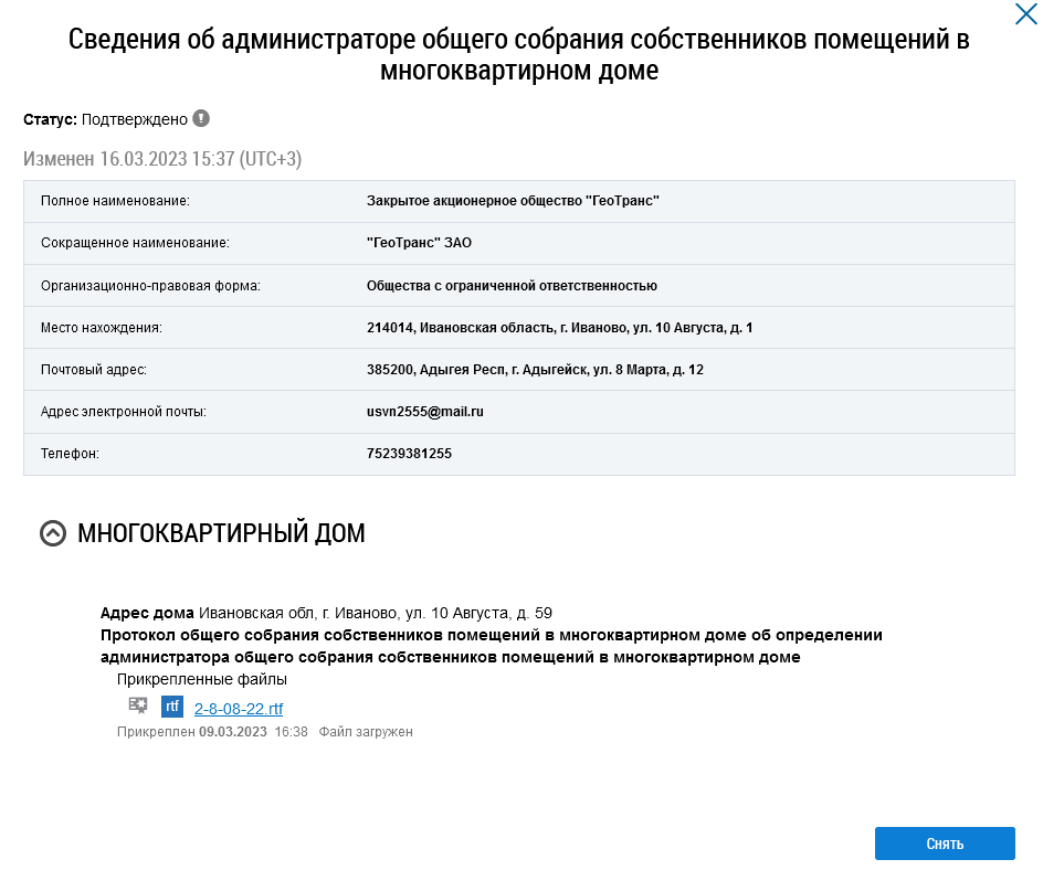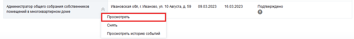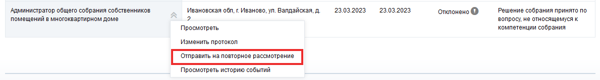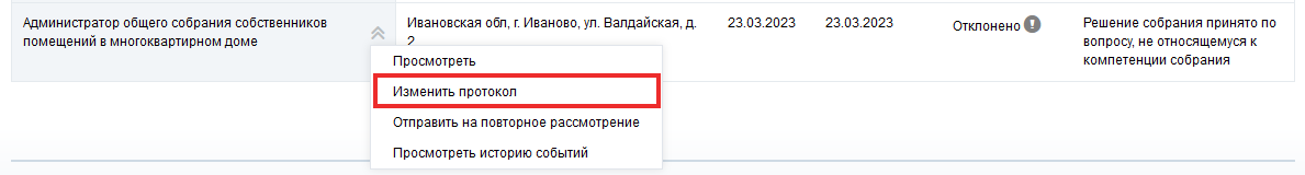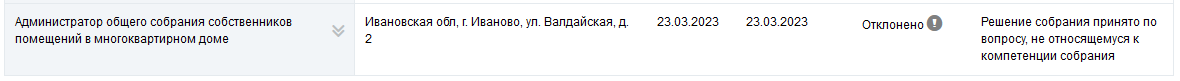 Если орган государственного жилищного надзора признал недействительный отправленный вами протокол общего собрания собственников об определении администратора общего собрания, статус функции изменится на Отклонено. В столбце Основание изменения статуса будет указано, почему.