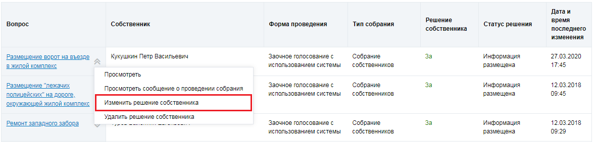 Для корректировки решения раскройте контекстное меню решения и выберите пункт Изменить решение собственника.