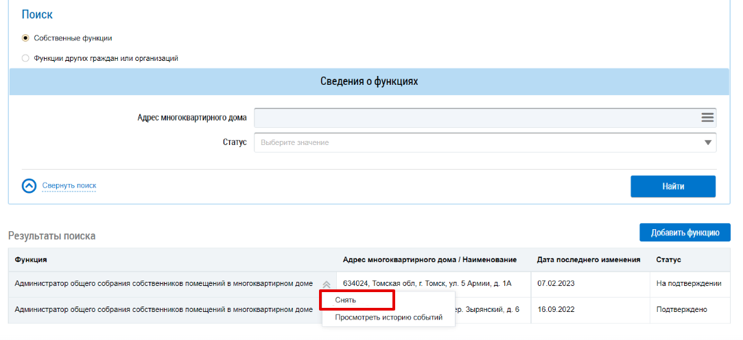 Чтобы снять функцию Администратор общего собрания собственников помещений в многоквартирном доме, перейдите на страницу Функции в системе и в контекстном меню интересующей вас функции выберите пункт Снять.