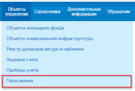 Для перехода в Реестр голосований в личный кабинет уполномоченного специалиста организации, обладающего правом доступа «Возможность участия в голосовании от имени организации», необходимо нажать на пункт Объекты управления горизонтального навигационного меню и выбрать пункт Голосования.