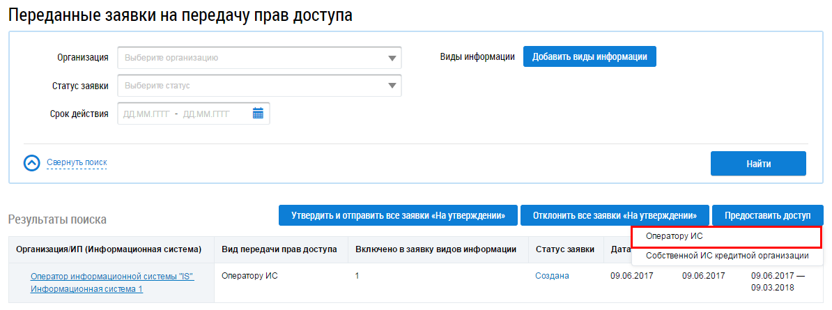 Для формирования заявки на предоставление прав доступа Оператору ИС нажмите на кнопку Предоставить доступ на странице Переданные заявки на передачу прав доступа и выберите в контекстном меню пункт Оператору ИС.