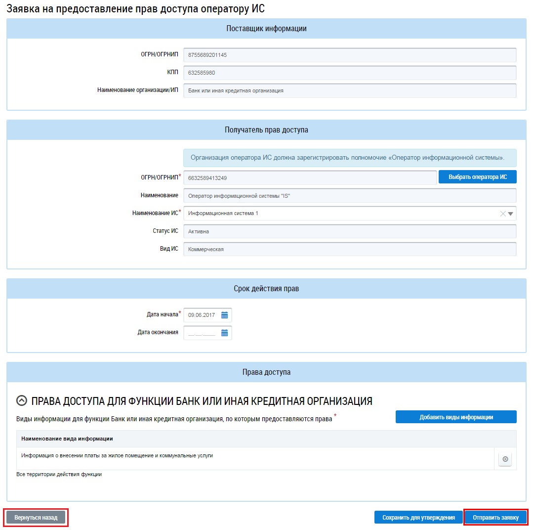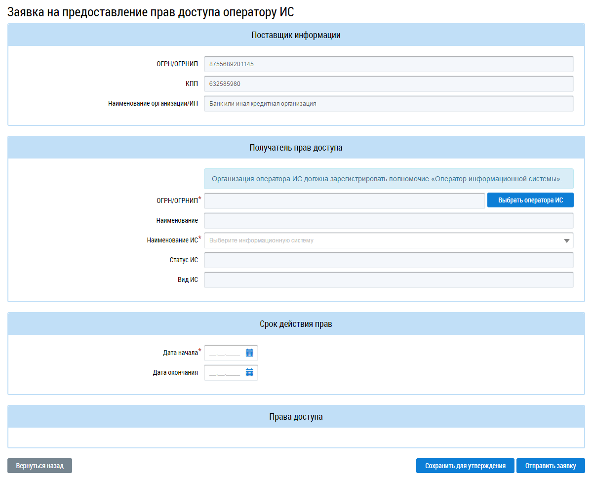 - администратору организации, который не является руководителем – с возможностью сохранения заявки без отправки Оператору ИС, для дальнейшего утверждения и отправки руководителем организации.