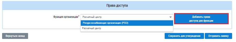 Заполните блок Права доступа. В случае наличия у организации нескольких функций выберите в выпадающем списке поля Функция организации необходимое значение и нажмите на кнопку Добавить права доступа для функции. Если у организации одна функция, данное поле не отображается.
