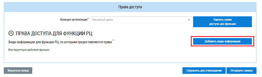 Укажите виды информации, по которым предоставляются права. Для добавления видов информации нажмите на кнопку Добавить виды информации.