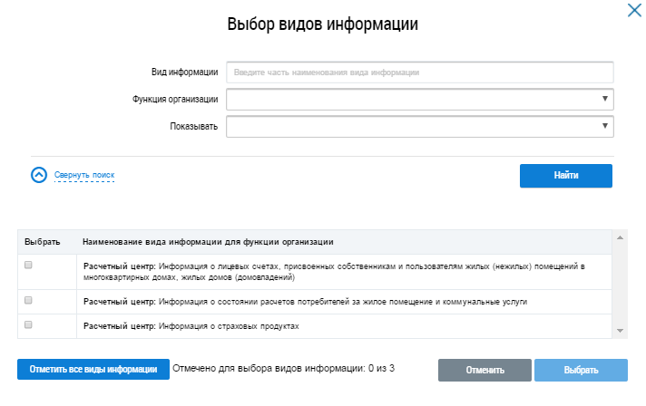 Установите флажок в поле необходимого вида информации и нажмите на кнопку Выбрать. При необходимости выбора всех видов информации нажмите на кнопку Отметить все виды информации.