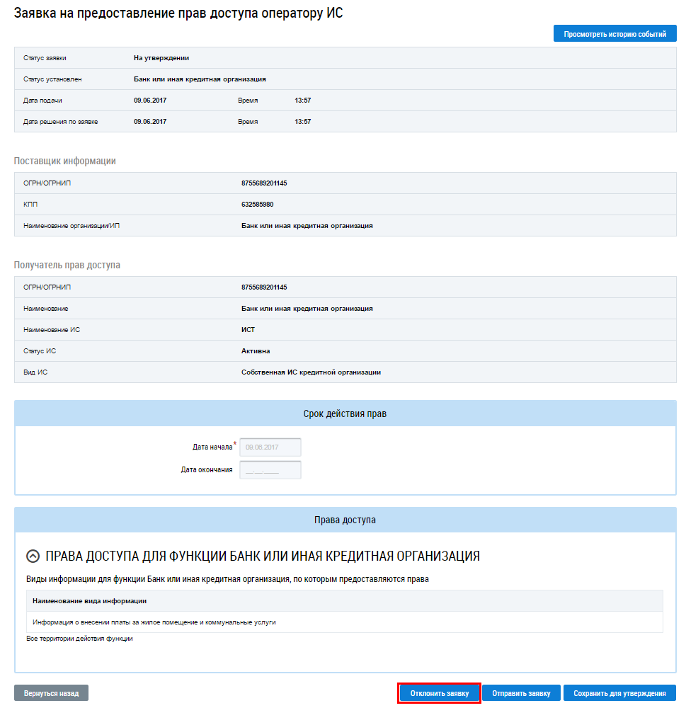 Рис. 1. Заявка на предоставление прав доступа Оператору ИС. Кнопка «Отклонить заявку»