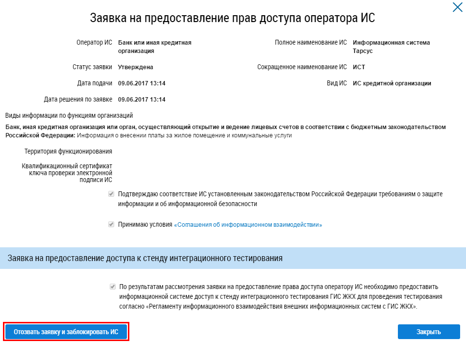 Система предоставляет возможность отозвать заявку и сразу заблокировать информационную систему. Операция отзыва заявки и блокировки ИС доступна для ИС в статусе Активна.