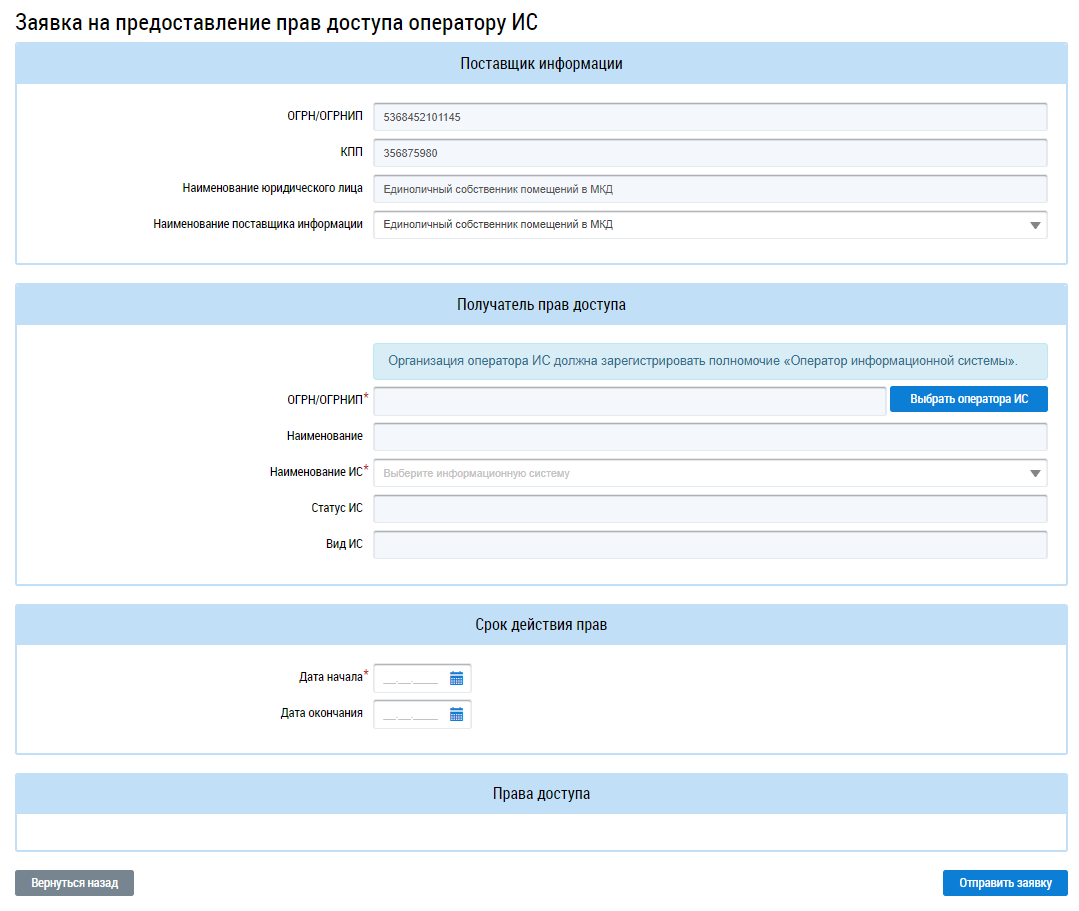 Отображается страница добавления заявки на предоставления прав доступа оператору ИС.