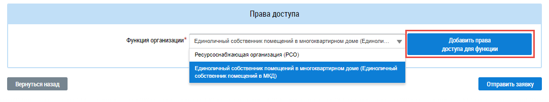 Заполните блок Права доступа. В случае наличия у организации нескольких функций выберите в выпадающем списке поля Функция организации необходимое значение и нажмите на кнопку Добавить права доступа для функции. Если у организации одна функция, данное поле не отображается.