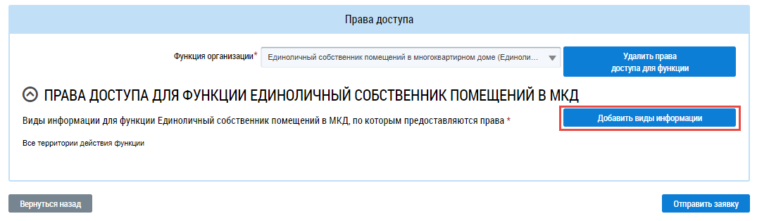 Укажите виды информации, по которым предоставляются права. Для добавления видов информации нажмите на кнопку Добавить виды информации.