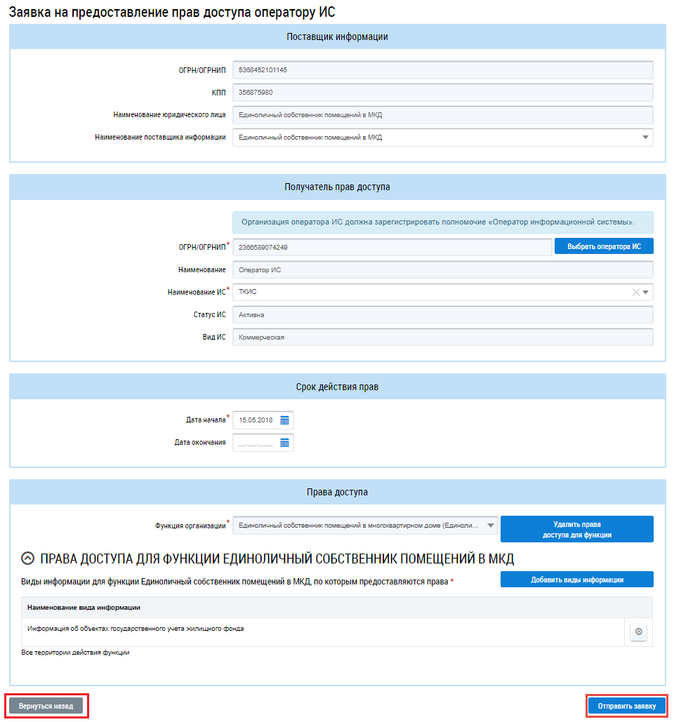 Для отправки заявки нажмите на кнопку Отправить заявку (доступно для руководителей организации), для отмены - Вернуться назад.