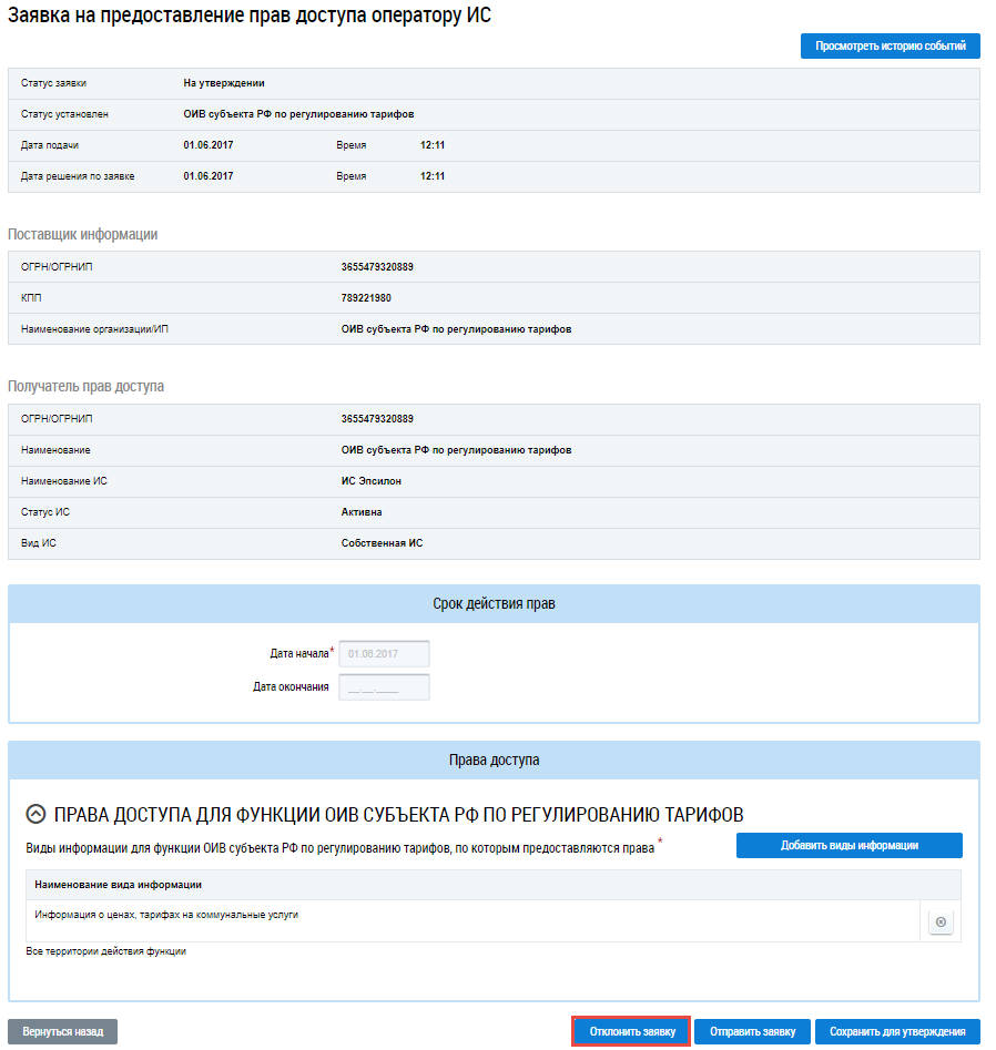 Операция отклонения заявки доступна руководителю организации для заявок в статусе На утверждении и Предзаполнена.