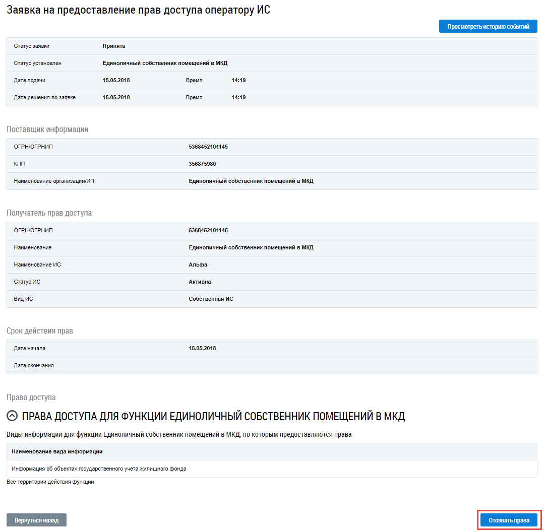 Операция отзыва прав доступа доступна для заявок в статусе Принята.