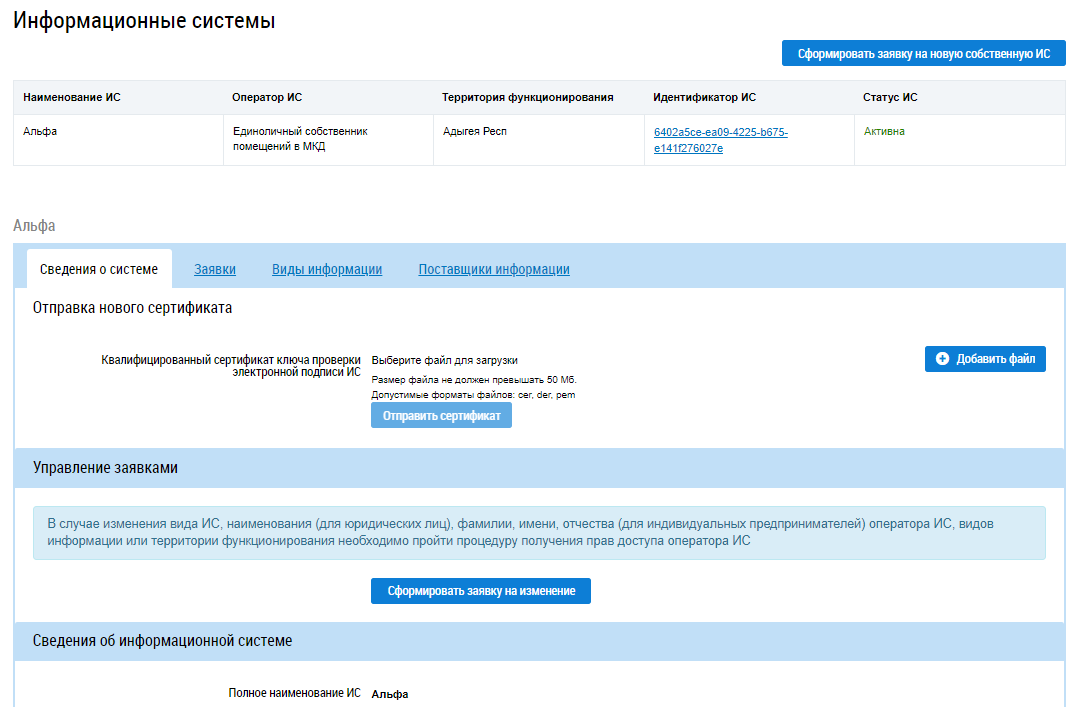Работа с информационными системами: формирование и отзыв заявки на ИС, просмотр информации об ИС, отправка сертификата ключа.