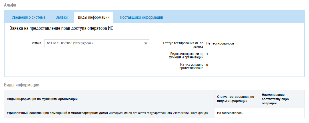 Вкладка Виды информации содержит сведения о тестировании ИС и результатах тестирования, если была подана заявка на тестирование. Для просмотра результатов тестирования определенной заявки выберите в выпадающем списке поля Заявка необходимое значение.
