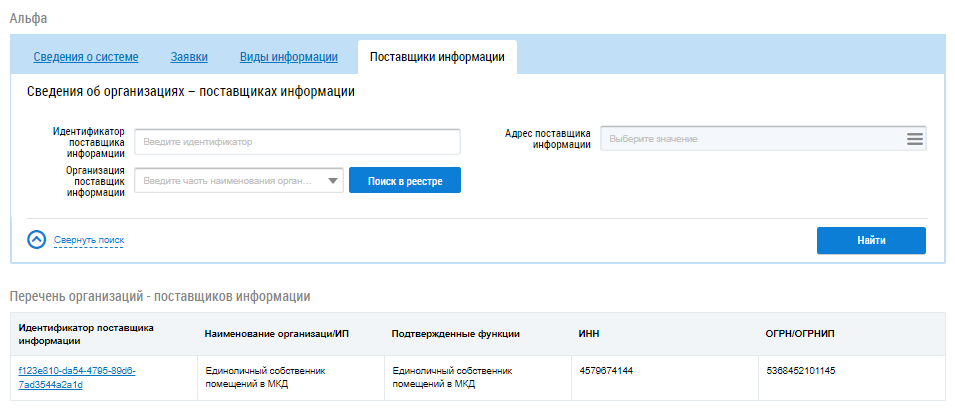 В случае необходимости воспользуйтесь блоком поиска организации. Установите необходимые параметры поиска и нажмите на кнопку Найти. В блоке Перечень организаций-поставщиков информации отобразятся организации, соответствующие поисковому запросу.