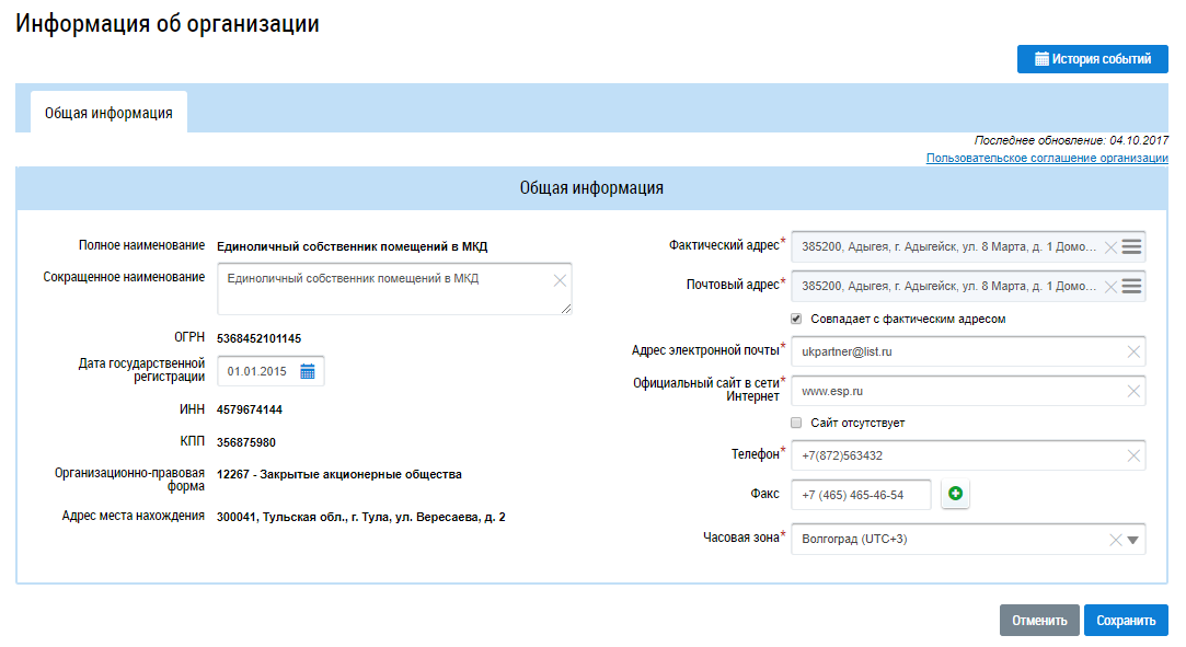 Часть полей на вкладке Общая информация заполнена данными, указанными при регистрации организации в ЕСИА. К этим полям относятся: