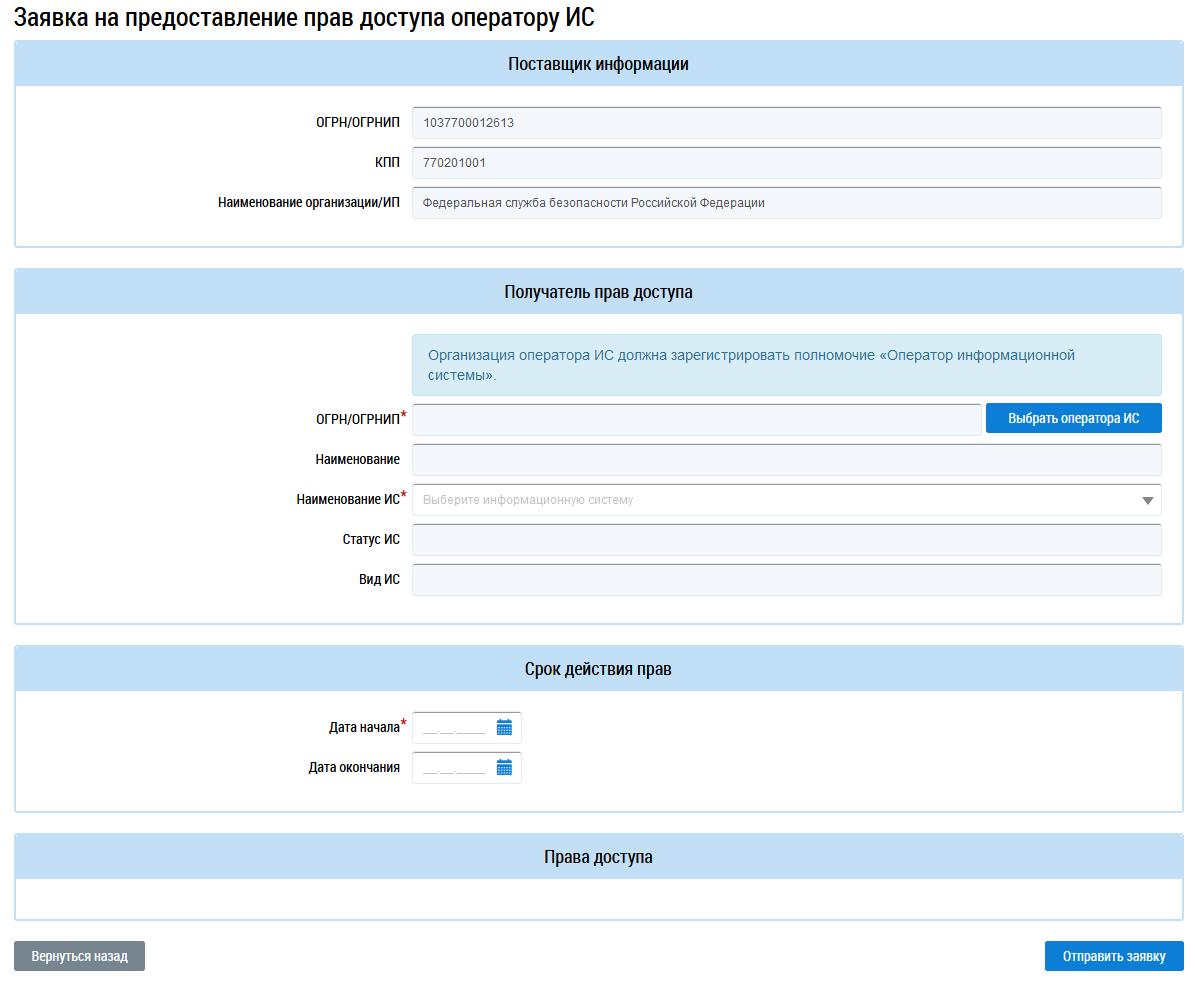 Рис. 2. Страница «Заявка на предоставление прав доступа оператору ИС»