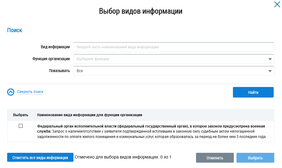 Установите флажок в поле необходимого вида информации и нажмите на кнопку Выбрать. При необходимости выбора всех видов информации нажмите на кнопку Отметить все виды информации.
