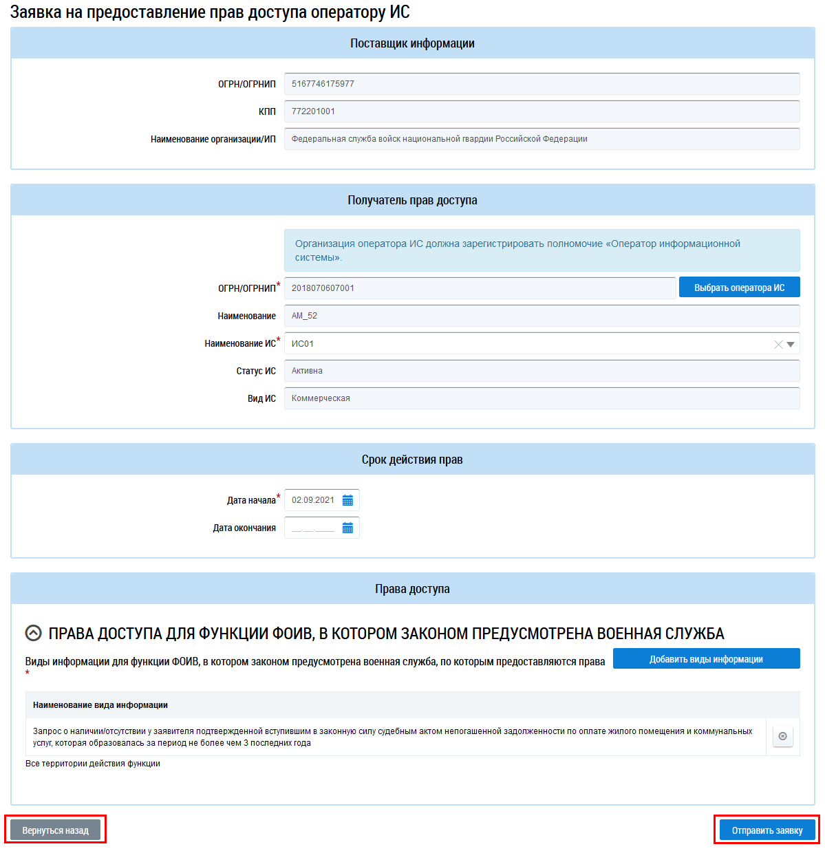 Рис. 5. Страница добавления заявки на предоставления прав доступа оператору ИС, кнопки «Отправить заявку», «Вернуться назад»