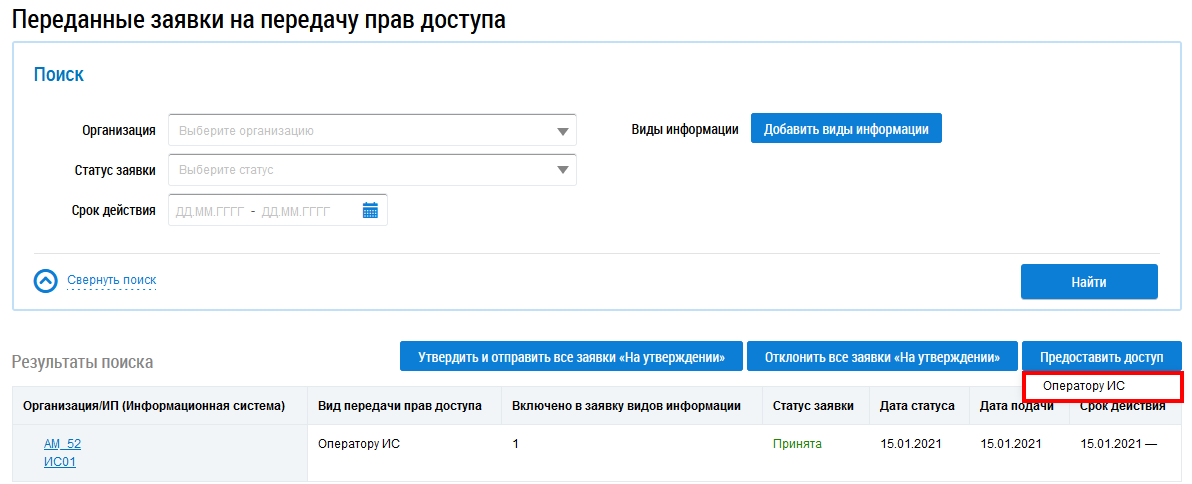 Для формирования заявки на предоставление прав доступа Оператору ИС нажмите на кнопку Предоставить доступ на странице Переданные заявки на передачу прав доступа и выберите в контекстном меню пункт Оператору ИС.