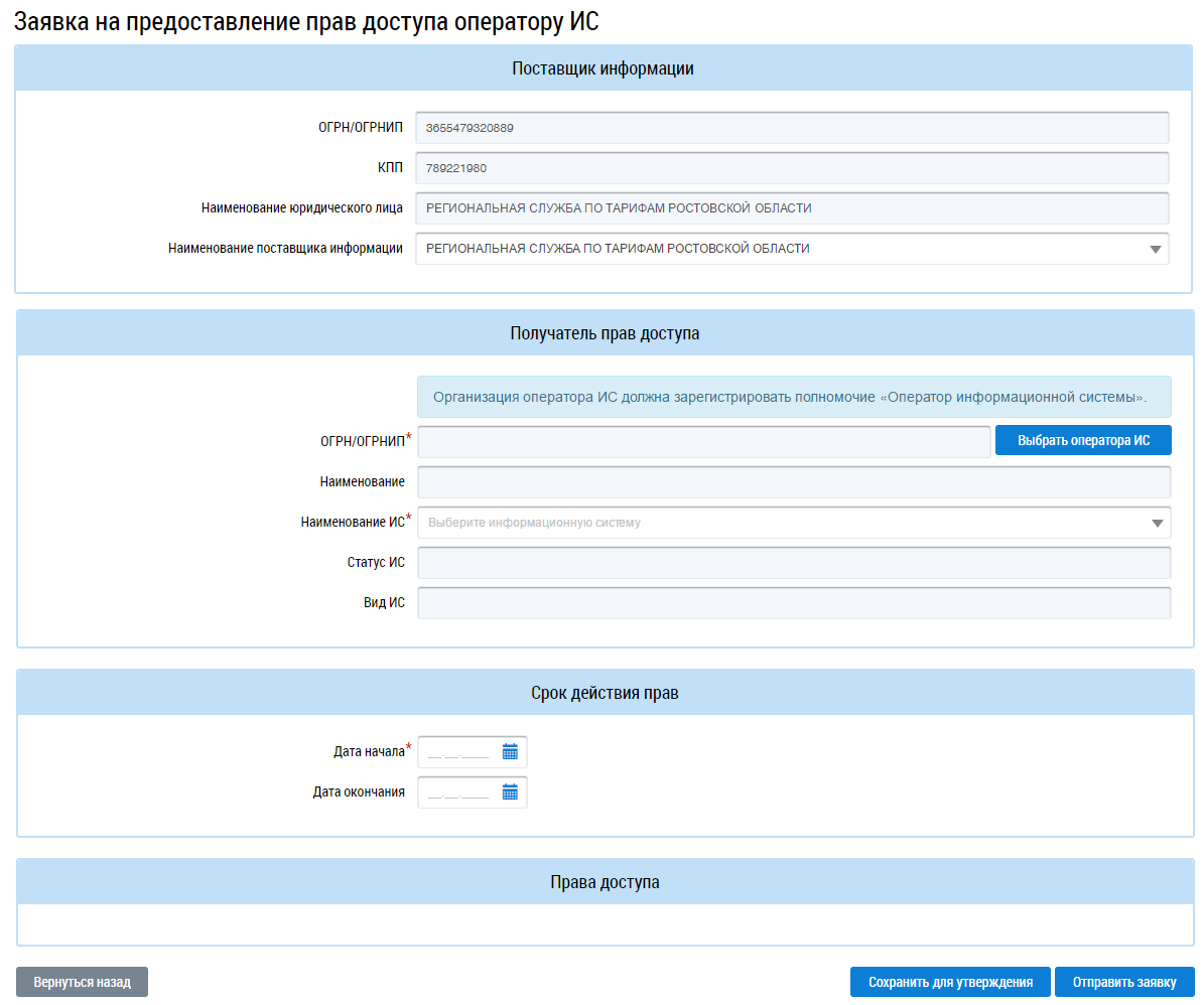 - администратору организации, который не является руководителем – с возможностью сохранения заявки без отправки Оператору ИС, для дальнейшего утверждения и отправки руководителем организации.