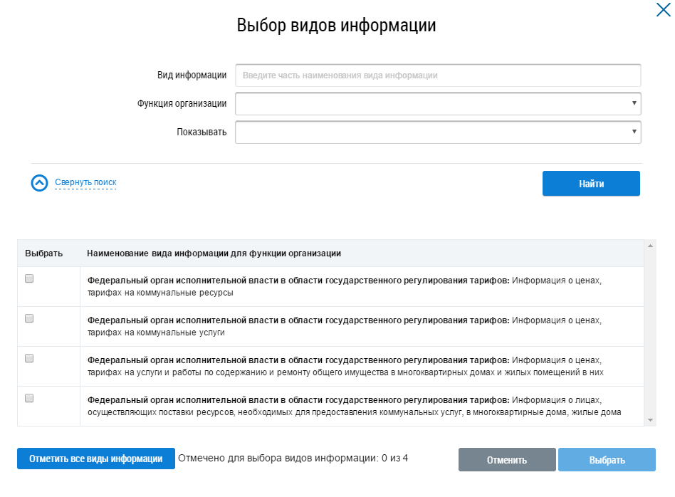 Установите флажок в поле необходимого вида информации и нажмите на кнопку Выбрать. При необходимости выбора всех видов информации нажмите на кнопку Отметить все виды информации.