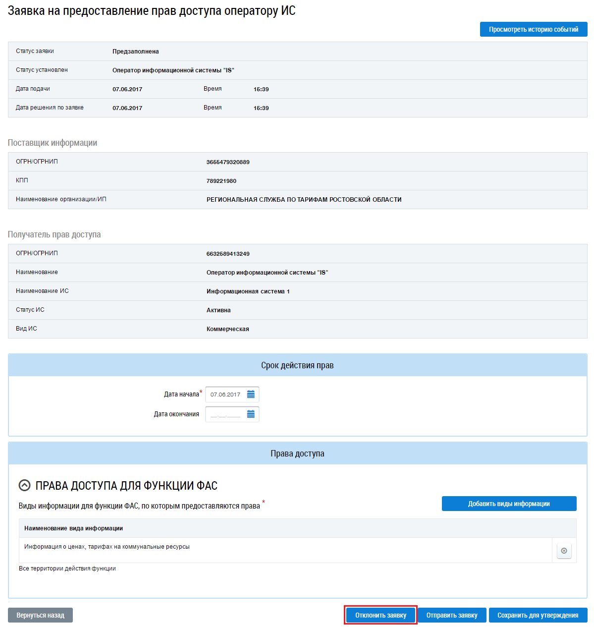 Рис. 1. Заявка на предоставление прав доступа Оператору ИС. Кнопка «Отклонить заявку»