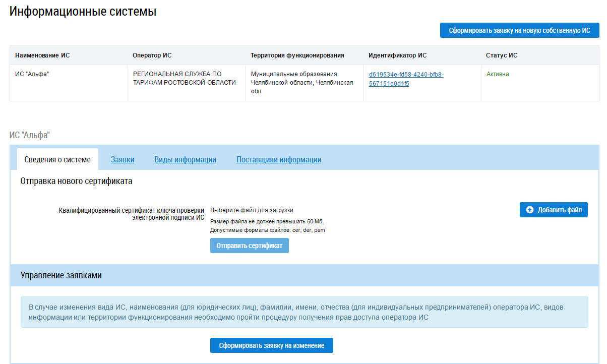 Работа с информационными системами: формирование и отзыв заявки на ИС, просмотр информации об ИС, отправка сертификата ключа.
