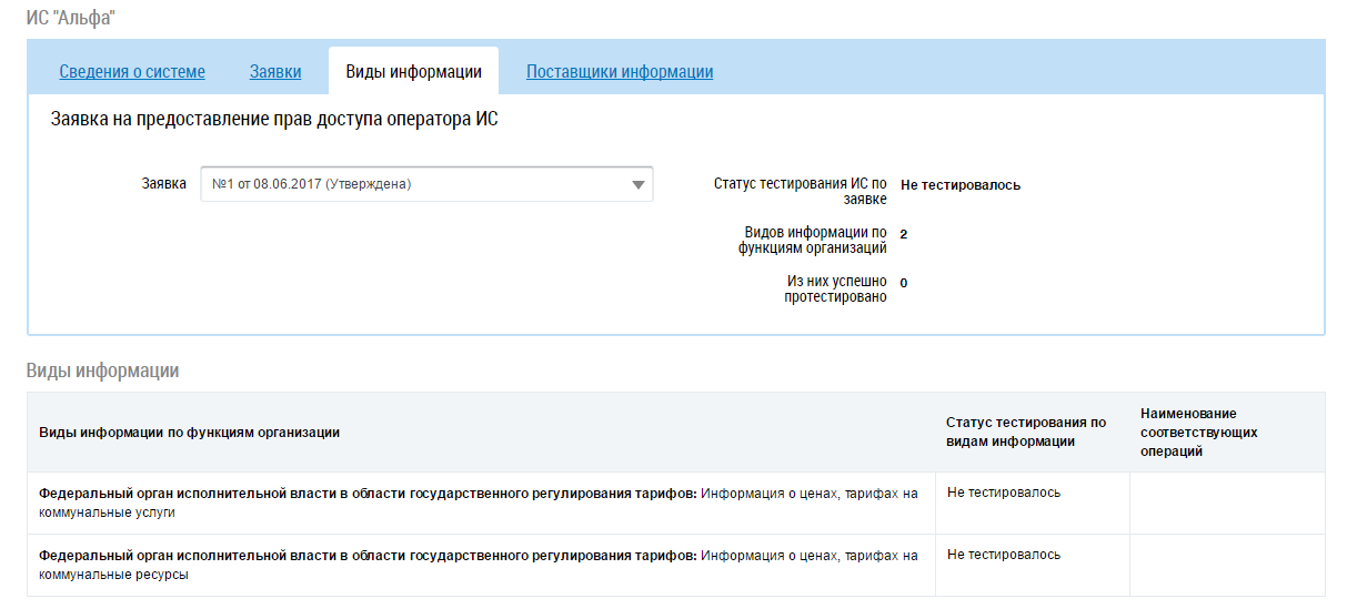 Вкладка Виды информации содержит сведения о тестировании ИС и результатах тестирования, если была подана заявка на тестирование. Для просмотра результатов тестирования определенной заявки выберите в выпадающем списке поля Заявка необходимое значение.