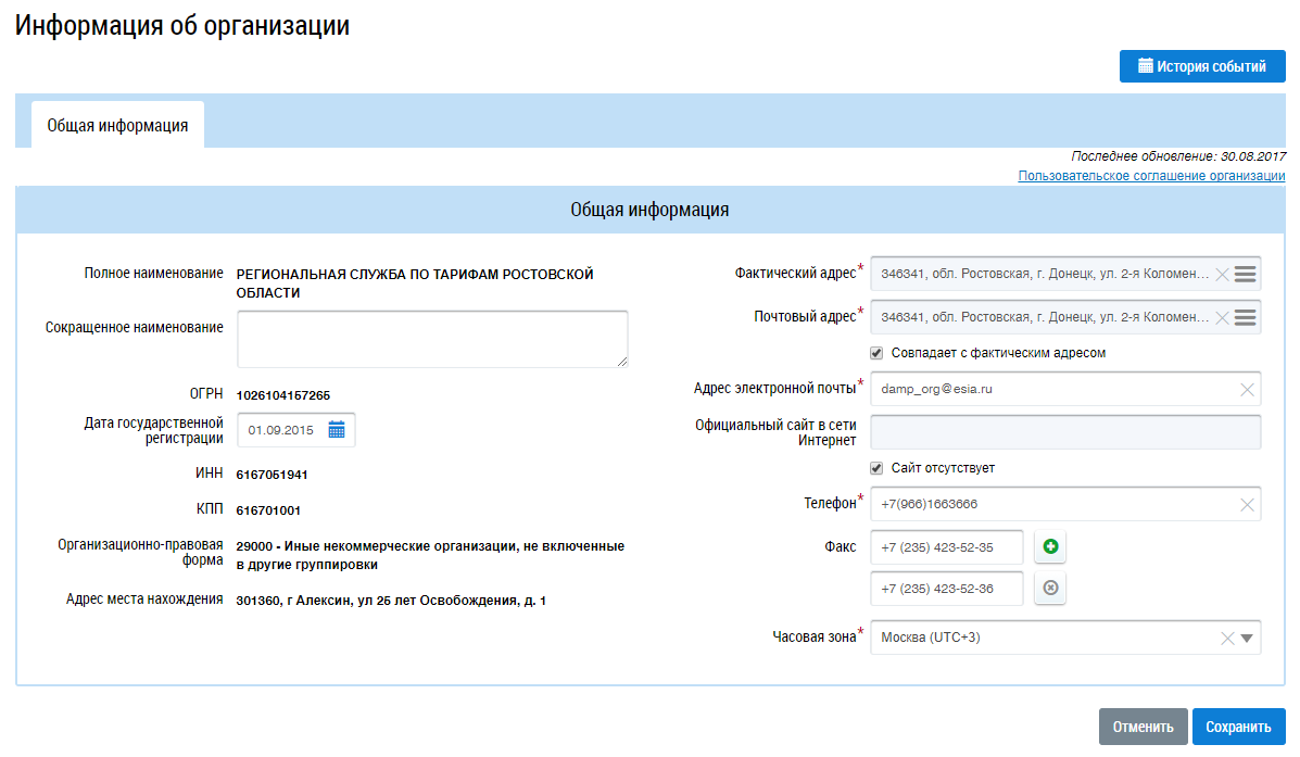 Часть полей на вкладке Общая информация заполнена данными, указанными при регистрации организации в ЕСИА. К этим полям относятся: