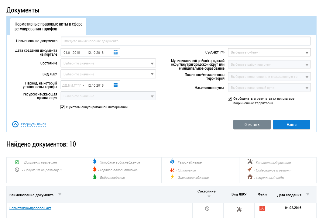 Для перехода к перечню нормативных правовых актов в сфере регулирования тарифов на ЖКУ в разделе горизонтального навигационного меню Дополнительная информация, выберите пункт Тарифы ЖКУ, в выпадающем списке выберите подпункт Нормативные правовые акты в сфере регулирования тарифов на ЖКУ (Раздел меню «Дополнительная информация»). Отображается страница Документы на вкладке Нормативные правовые акты в сфере регулирования тарифов.