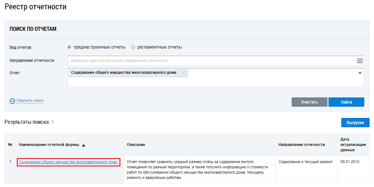 Для перехода на страницу Анализ стоимости обслуживания общего имущества многоквартирного дома, текущего ремонта и аварийных работ установите переключатель Вид отчетов в положение Преднастроенные отчеты. Затем нажмите на гиперссылку с наименованием отчета Содержание общего имущества многоквартирного дома.