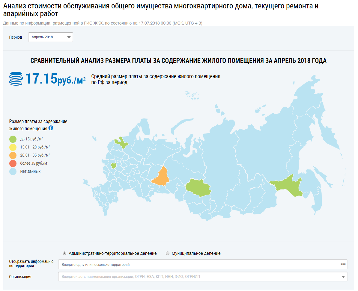 При наведении курсора на определенный субъект на карте отображается информация о среднем размере платы за содержание жилого помещения на квадратный метр.