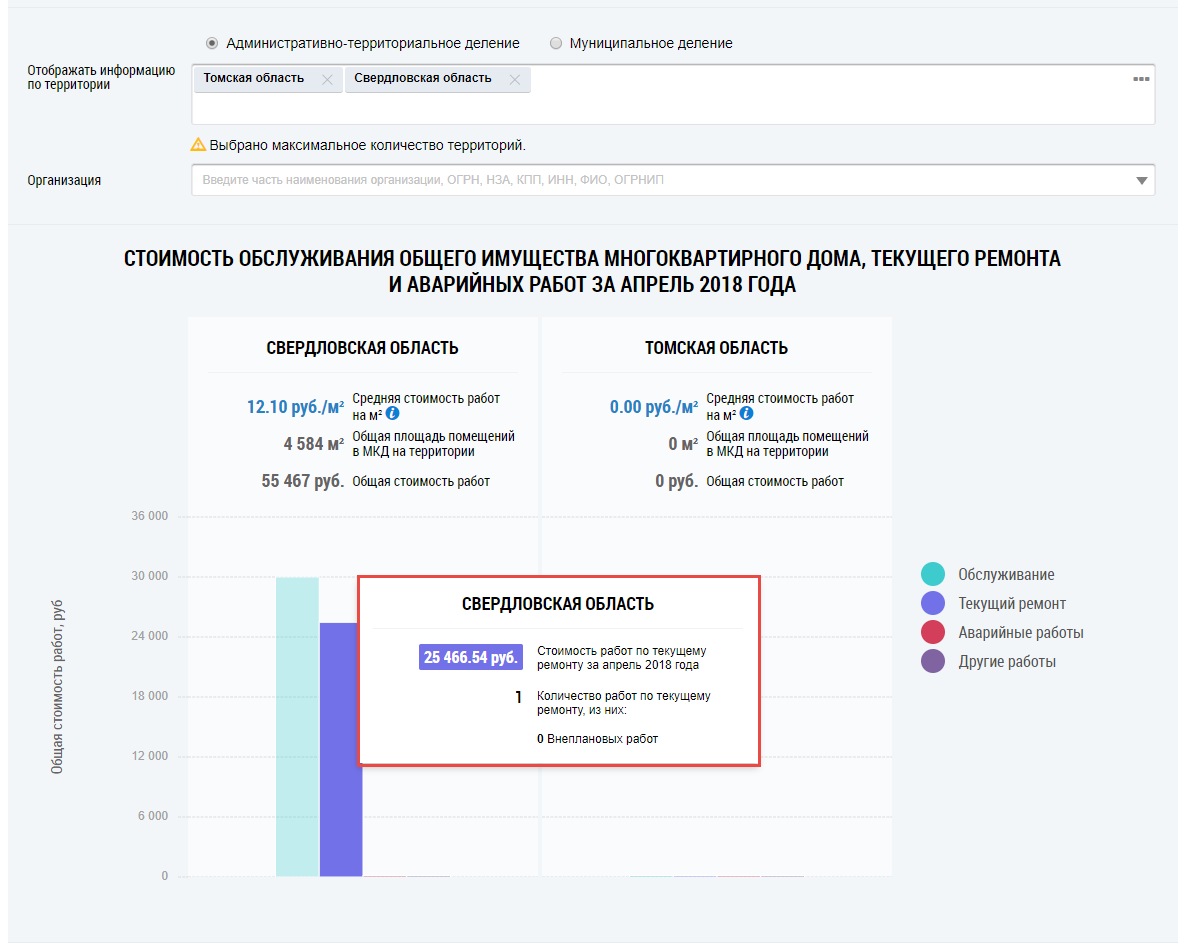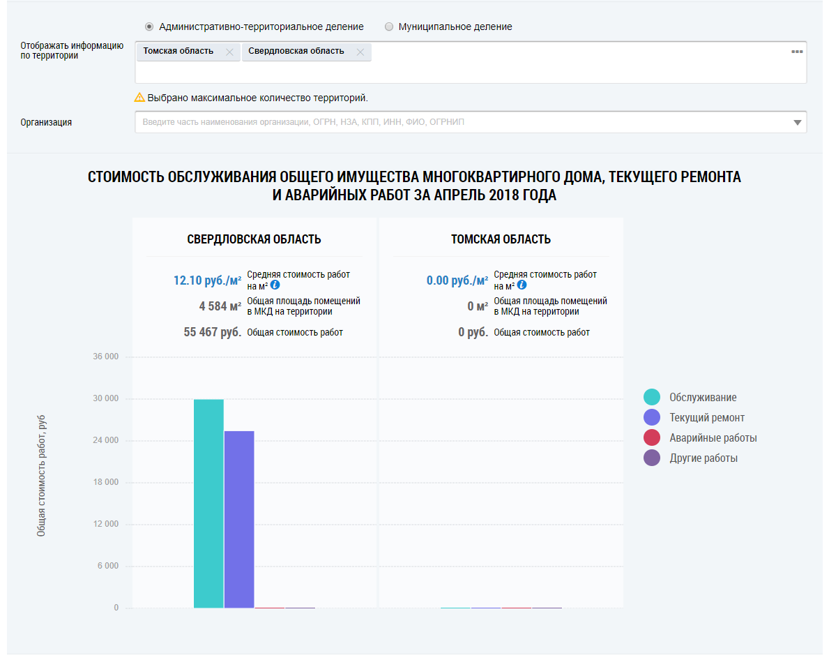 Под картой расположена гистограмма с информацией о стоимости обслуживания общего имущества многоквартирного дома, текущего ремонта, аварийных и других работ (работ по обращениям граждан, работ по ограничениям поставки, подготовка ОКИ к отопительному сезону, иных работ). По умолчанию на гистограмме отображается информация по РФ в целом.