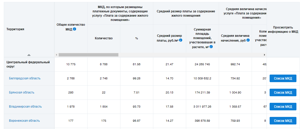 об условиях отображения данных в столбце.Для просмотра информации о МКД нажмите на кнопку Список МКД. Отображается информация о МКД на выбранной территории.