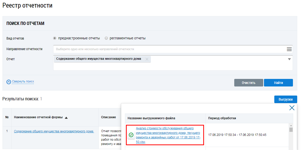 Для сохранения сформированного отчета перейдите на страницу Реестр отчетности, нажмите на кнопку Выгрузки и выберите в выпадающем списке необходимый отчет. Файл отчета хранится в Системе 10 дней.