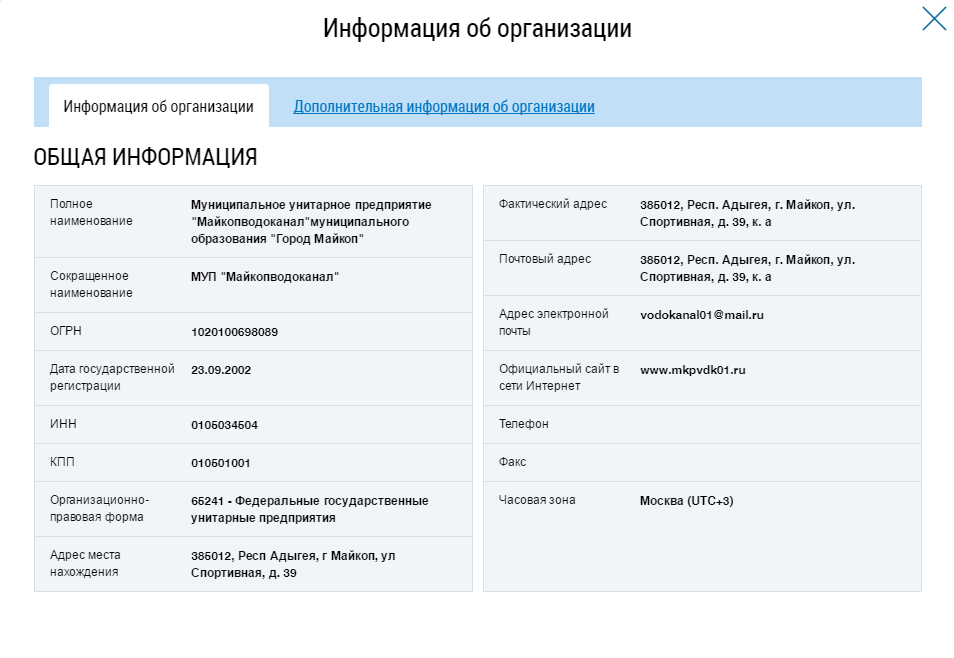 Нажмите на гиперссылку с наименованием организации. Отображается окно Информация об организации.