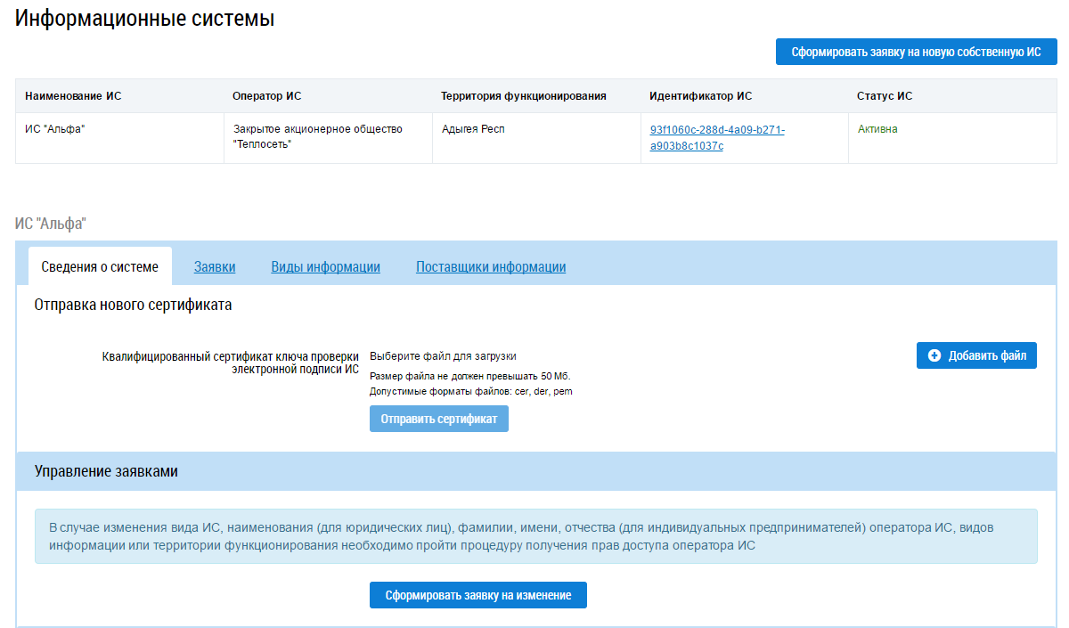 Работа с информационными системами: формирование и отзыв заявки на ИС, просмотр информации об ИС, отправка сертификата ключа.