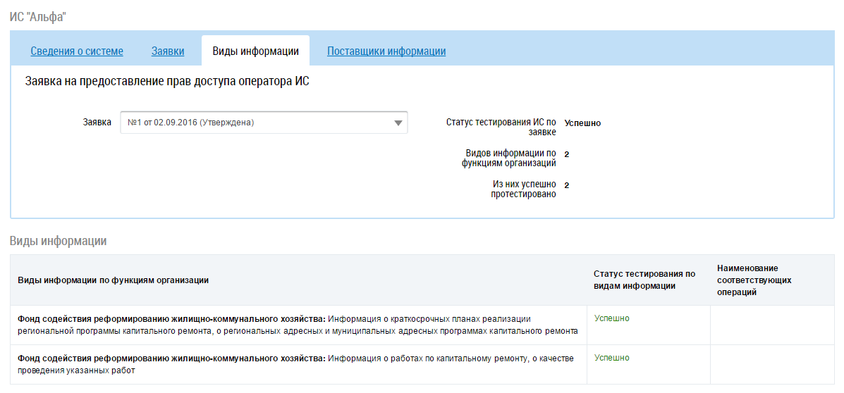 Вкладка Виды информации содержит сведения о тестировании ИС и результатах тестирования, если была подана заявка на тестирование. Для просмотра результатов тестирования определенной заявки выберите в выпадающем списке поля Заявка необходимое значение.