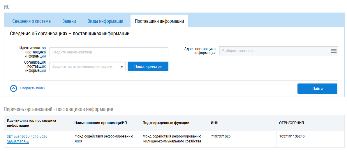 В случае необходимости воспользуйтесь блоком поиска организации. Установите необходимые параметры поиска и нажмите на кнопку Найти. В блоке Перечень организаций-поставщиков информации отобразятся организации, соответствующие поисковому запросу.